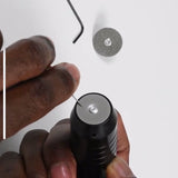 When grinding the electrode tips the electrodes are held on the rotating diamond disc at a flat angle (approx. 15°) and turned between the fingers. It is also possible to grind multiple electrodes simultaneously. The diamond disc is securely embedded in a stable aluminium housing, so that only the front of the grinding surface is accessible.